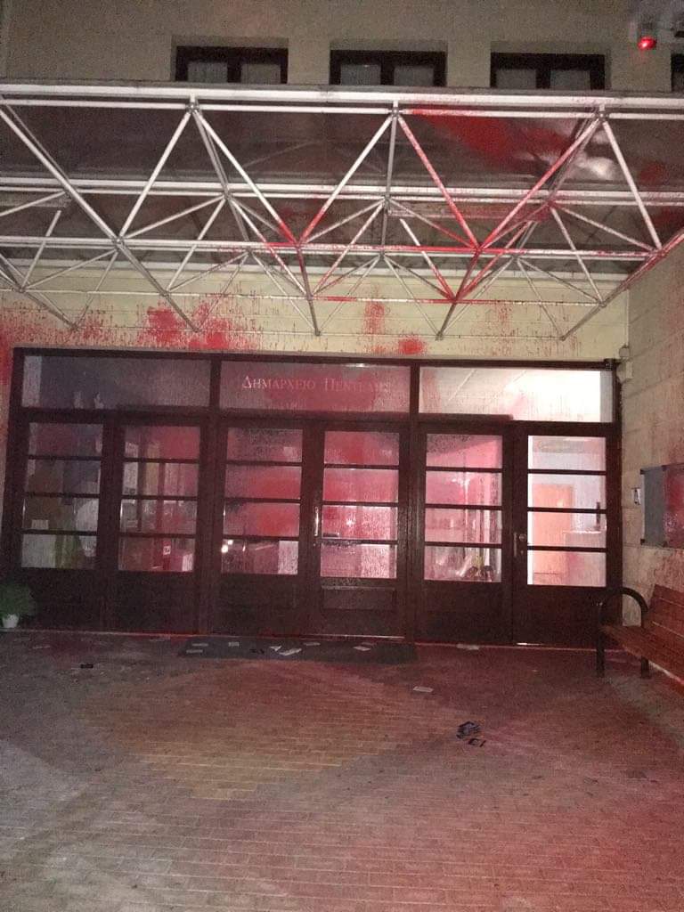 Επίθεση με μπογιές πραγματοποίησαν άγνωστοι στη διάρκεια της νύχτας στο δημαρχείο Πεντέλης - Πρόσφατα είχαν δημιουργηθεί αντιδράσεις αλλά και πολιτική αντιπαράθεση με αφορμή την άρνηση της προέδρου της ΟΝΝΕΔ Πεντέλης να μεταφερθούν μετανάστες στο νοσοκομείο Αμαλία Φλέμινγκ