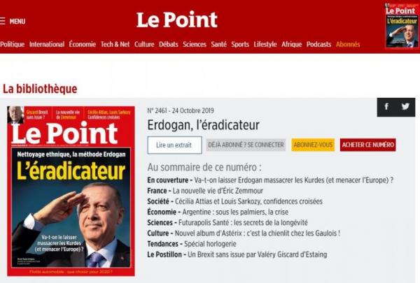 Το εξώφυλλο του Le Point, στο οποίο ο Ερντογάν κατηγορείται για «εθνικές εκκαθαρίσεις» εναντίον των Κούρδων της Συρίας στο πλαίσιο της επίθεσης που εξαπέλυσεστη βορειοανατολική περιοχή της χώρας, προκάλεσε την οργή της τουρκικής κυβέρνησης.