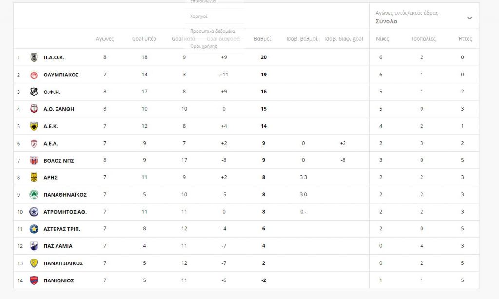 Ο ΠΑΟΚ πέρασε νικηφόρα από τον Βόλο (0-2) και ανέβηκε στην κορυφή της βαθμολογίας, έχοντας 20 βαθμούς, αλλά και έναν αγώνα περισσότερο από τον δεύτερο Ολυμπιακό (19). Οι Ασπρόμαυροι επικράτησαν του ελλιπέστατου Βόλου, ο οποίος έμεινε στους 9 βαθμούς και πλέον βρίσκεται στην 7η θέση της βαθμολογίας.