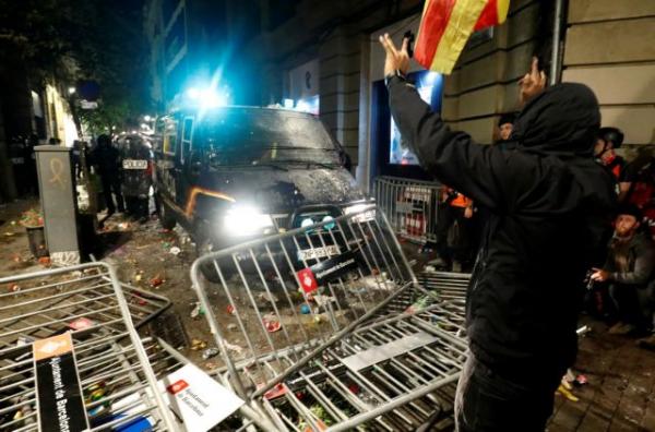 Δεκάδες αστυνομικοί των μονάδων αντιμετώπισης ταραχών με ασπίδες και όπλα και με τη συνδρομή αστυνομικών βαν εφόρμησαν το βράδυ του Σαββάτου για να διαλύσουν το πλήθος των διαδηλωτών υπέρ της ανεξαρτησίας της Καταλονίας, οι οποίοι είχαν συγκεντρωθεί έξω από το αρχηγείο της αστυνομίας στο κέντρο της Βαρκελώνης.
