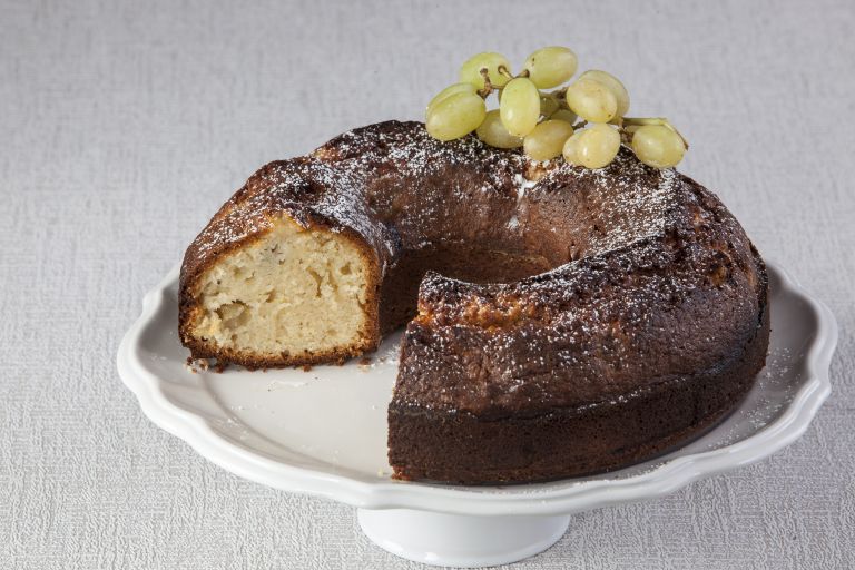 Προθερμαίνουμε τον φούρνο στους 180°C. Χτυπάμε καλά στο μίξερ τα αβγά με τη ζάχαρη άχνη να αφρατέψουν. Προσθέτουμε σιγά-σιγά το σπορέλαιο. Αναμειγνύουμε σε ένα μπολ το αλεύρι με το μπέικιν πάουντερ. Χαμηλώνουμε την ταχύτητα του μίξερ και προσθέτουμε τη σκόνη αμυγδάλου και κατόπιν εναλλάξ το γιαούρτι με το αλεύρι και το μπέικιν πάουντερ. Βάζουμε τις ρώγες του σταφυλιού σε ένα μπολ και τις ανακατεύουμε με τη 1 κ.σ. αλεύρι. Λαδώνουμε και αλευρώνουμε καλά μια μεσαία φόρμα για κέικ. Αδειάζουμε το μείγμα του κέικ στη φόρμα. Βάζουμε από πάνω τις ρώγες και τις πιέζουμε ελαφρά να μπουν λίγο στο μείγμα. Ψήνουμε για 50-55 λεπτά.