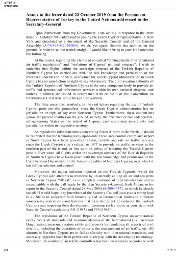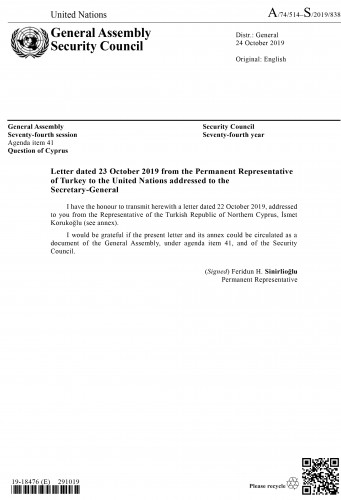 «Σύμφωνα με τις οδηγίες της κυβέρνησής μου [ψευδοκράτος], γράφω σε απάντηση της επιστολής της 11ης Οκτωβρίου 2019 που σας απευθύνθηκε από τον Ελληνοκύπριο εκπρόσωπο στη Νέα Υόρκη και κυκλοφόρησε ως έγγραφο του Συμβουλίου Ασφαλείας και της Γενικής Συνέλευσης (A / 74 / 495- S / 2019/809), η οποία, για άλλη μια φορά, στρεβλώνει τις πραγματικότητες. Για να θέσουμε τα πράγματα σε μια σειρά, θα ήθελα να επιστήσω την προσοχή σας στα ακόλουθα.