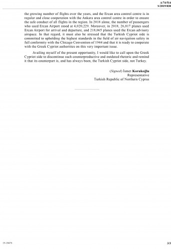 Όσον αφορά στις ψευδείς δηλώσεις σχετικά με το αεροδρόμιο Ercan στον Βορρά, θα πρέπει να επαναληφθεί ότι το τεχνολογικά αναβαθμισμένο κέντρο ελέγχου της περιοχής Ercan και ο αερολιμένας στη Βόρεια Κύπρο παρέχουν τακτικά, αξιόπιστα και ασφαλή δρομολόγια εναέριας κυκλοφορίας μετά την άρνηση της ελληνοκυπριακής πλευράς το 1977 για την παροχή υπηρεσιών εναέριας κυκλοφορίας στο βόρειο τμήμα του νησιού, σύμφωνα με την πολιτική απομόνωσης του τουρκοκυπριακού λαού.