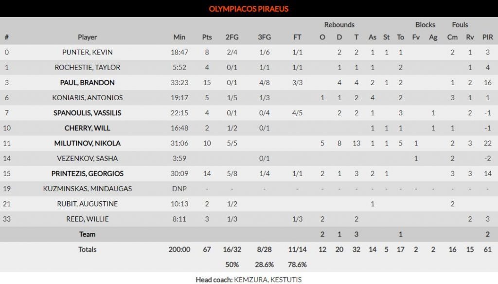 Ο Ολυμπιακός έχει πράγματα να κρατήσει από το παιχνίδι. Η εξαιρετική εμφάνιση του Πολ, ο οποίος δείχνει καλύτερος κάθε βραδιά, η πολύ καλή παρουσία του Κόνιαρη, ο οποίος είναι σκληρός στην άμυνα και πιο ώριμος απ’ ότι δείχνει η ηλικία, αλλά κι η συμμετοχή του σε αυτό το επίπεδο, είναι τα καλύτερα από αυτά. Ο Πάντερ δίνει λύσεις με το καλό του σουτ, ο Μιλουτίνοφ δείχνει να ανεβάζει στροφές και να βελτιώνεται σωματικά, ο Πρίντεζης (παίρνοντας κι ανάσες) έκανε σπουδαία εμφάνιση.