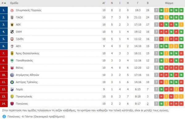 Η βαθμολογία μετά από 10 αγωνιστικές: