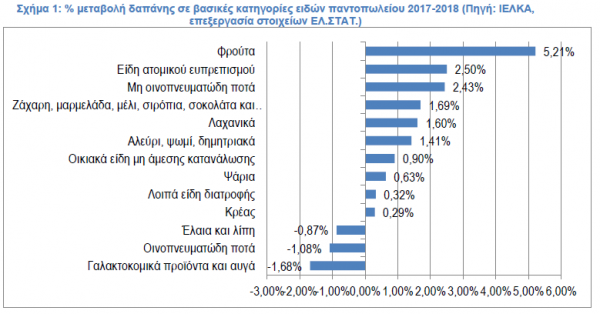 Σημειώνεται ότι οι μεταβολές αυτές έχουν πολύ μικρή επίδραση από τις αλλαγές στις τιμές καθώς ο δείκτης τιμών καταναλωτή της ΕΛΣΤΑΤ για τα τρόφιμα και μη αλκοολούχα ποτά παρουσιάζει ελάχιστη αύξηση το 2018 κατά 0,40% σε σχέση με το 2017, ενώ και οι επιμέρους δείκτες έχουν μικρότερες μεταβολές. Π.χ. ο αντίστοιχος δείκτης τιμών για τα φρούτα παρουσιάζει αύξηση κατά 1,64%, ενώ οι αγορές φρούτων αυξήθηκαν κατά 5,21%. Οι διαφοροποιήσεις μπορούν επομένως να αποδοθούν σε εναλλακτικές επιλογές των καταναλωτών, σε επιλογή διαφορετικού μείγματος προϊόντων, ακόμα και σε διαφοροποίηση στις διατροφικές συνήθειες.