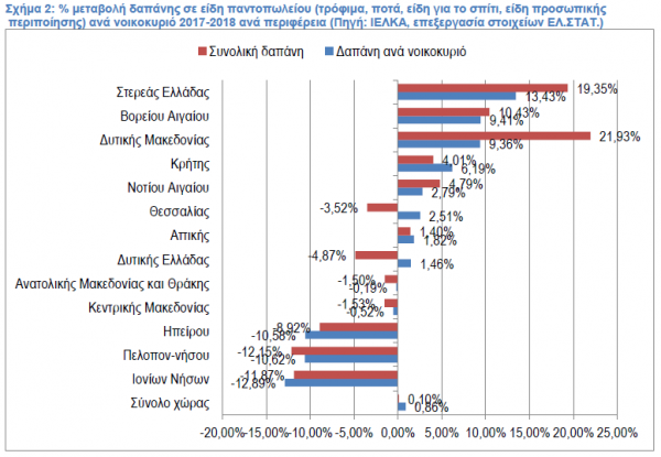 Στη δυτική Μακεδονία και στη Στερεά Ελλάδα συγκεκριμένα υπάρχει αύξηση τόσο στη δαπάνη ανά νοικοκυριό, όσο και αύξηση των νοικοκυριών κατά 11,50% και 5,21% αντίστοιχα, κάτι που οδηγεί σε συνολική αύξηση της δαπάνης.