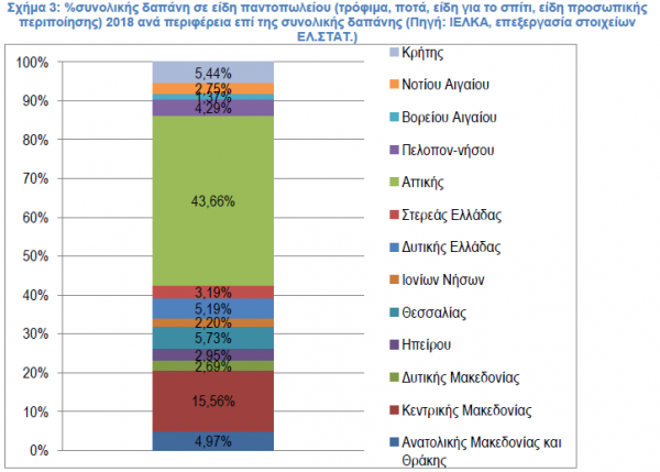 Παρά αυτές τις μεταβολές η Αττική εξακολουθεί να είναι η περιοχή με τη μεγαλύτερη δαπάνη, με δαπάνη 7,78 δισ. ευρώ και ποσοστό 43,66% επί του συνόλου.