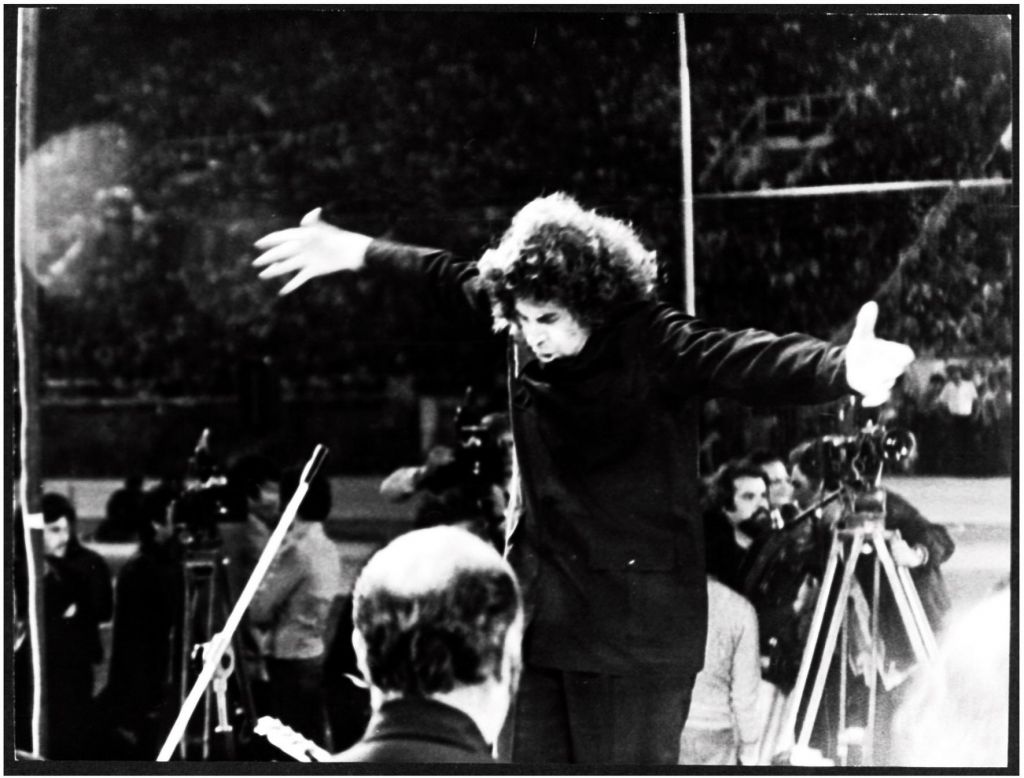Ο Μίκης Θεοδωράκης το 1974 μετά την πτώση της Δικτατορίας επιστρέφει στην Ελλάδα και δίνει δύο ιστορικές συναυλίες στο Στάδιο Καραϊσκάκη.