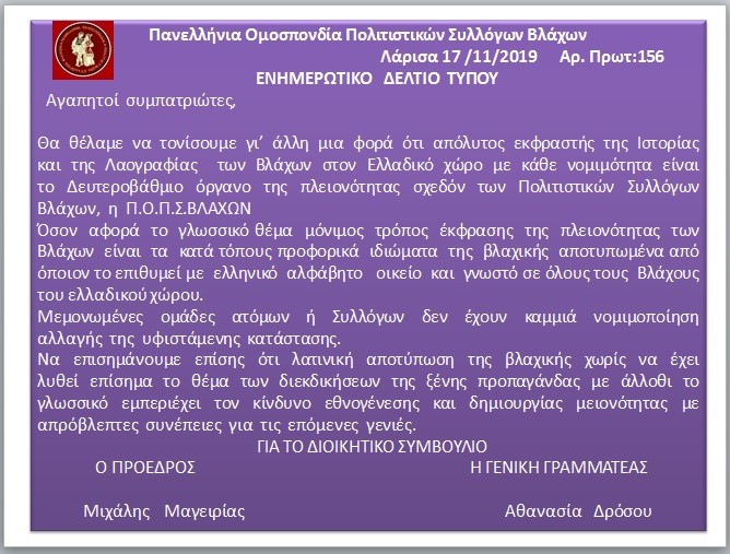 «Θα θέλαμε να τονίσουμε γι’ άλλη μια φορά ότι απόλυτος εκφραστής της Ιστορίας και της Λαογραφίας των Βλάχων στον Ελλαδικό χώρο με κάθε νομιμότητα είναι το Δευτεροβάθμιο όργανο της πλειονότητας σχεδόν των Πολιτιστικών Συλλόγων Βλάχων, η Π.Ο.Π.Σ.ΒΛΑΧΩΝ