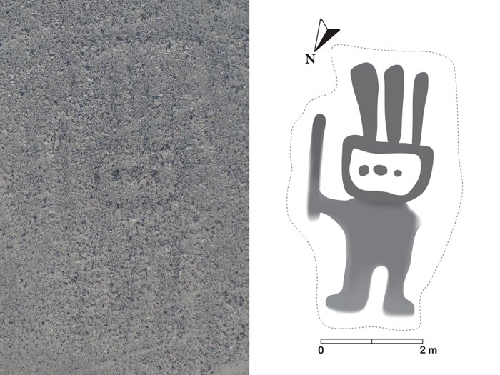 Οι ερευνητές του ιαπωνικού Πανεπιστημίου Γιαμαγκάτα, με επικεφαλής τον καθηγητή ανθρωπολογίας και αρχαιολογίας Μασάτο Σακάι, κατέφυγαν από το 2018 στο σύστημα μηχανικής μάθησης της ΙΒΜ, το οποίο τροφοδότησαν αρχικά με εικόνες από ήδη γνωστά γεωγλυφικά, ώστε να το «εκπαιδεύσουν», και στη συνέχεια με νέες φωτογραφίες. Το σύστημα εντόπισε νέες περιοχές ενδιαφέροντος και έτσι οι ερευνητές βρήκαν μια άγνωστη έως τώρα ανθρωπόμορφη γεωγλυφική φιγούρα με τετράγωνο κεφάλι, η οποία στέκεται στα δύο πόδια της και κρατά κάτι σαν μπαστούνι. Έχει μήκος περίπου τεσσάρων μέτρων και πλάτος δύο μέτρων, ενώ εκτιμάται ότι δημιουργήθηκε μεταξύ του 100 π.Χ. και του 100 μ.Χ.