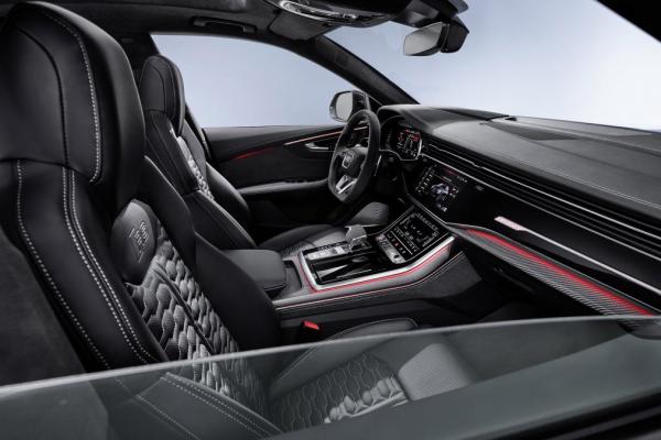 Στο εσωτερικό του RS Q8 κυριαρχεί αντιστοίχως πολεμική όσο και άρτια εξοπλιστική εικόνα καθώς ο ψηφιακός πίνακας οργάνων και το infotainment των 10,1 ιντσών, έχουν αποκτήσει νέα γραφικά και εφαρμογές στα πρότυπα του νέου πιο αθλητικού προσανατολισμού της έκδοσης ενώ το ίδιο ισχύει και για τα υπόλοιπα στοιχεία του θαλάμου επιβατών, όπως προκύπτει από το σπορ τιμόνι, τα πεντάλ αλουμινίου και τα σπορ καθίσματα που επωφελούνται από λειτουργίες κλιματισμού και μασάζ.