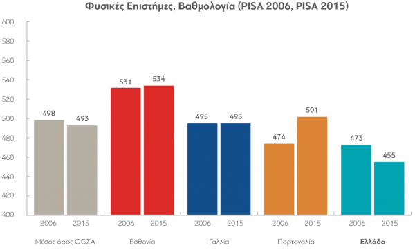 Για παράδειγμα, στο γράφημα για τις φυσικές επιστήμες το 2015 οι μαθητές όλων των χωρών του ΟΟΣΑ βαθμολογήθηκαν κατά μέσο όρο με 493 μονάδες. Οι Έλληνες μαθητές πήραν κατά μέσο όρο 455 μονάδες.