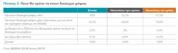 «Σύμφωνα με την έρευνά μας, οι απόψεις για το «ποιοι θα έπρεπε να έχουν το δικαίωμα να ψηφίζουν» διίστανται μεταξύ αυτών που πιστεύουν ότι το δικαίωμα πρέπει να αποδοθεί μόνο σε όσους έχουν πιο στενή και πρόσφατη σχέση με την Ελλάδα (44,4%) και αυτών που πιστεύουν ότι όλοι θα πρέπει να έχουν αυτό το δικαίωμα (43%).