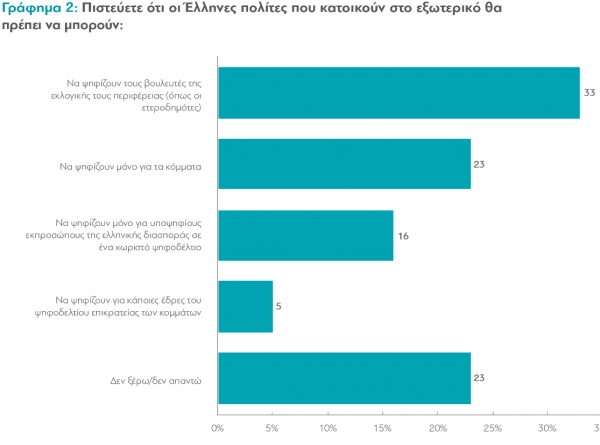 «Σύμφωνα με την έρευνά μας, οι απόψεις για το “ποιοι θα έπρεπε να έχουν το δικαίωμα να ψηφίζουν” διίστανται μεταξύ αυτών που πιστεύουν ότι το δικαίωμα πρέπει να αποδοθεί μόνο σε όσους έχουν πιο στενή και πρόσφατη σχέση με την Ελλάδα (44,4%) και αυτών που πιστεύουν ότι όλοι θα πρέπει να έχουν αυτό το δικαίωμα (43%).
