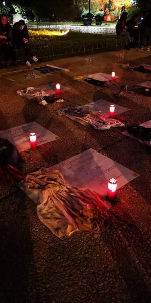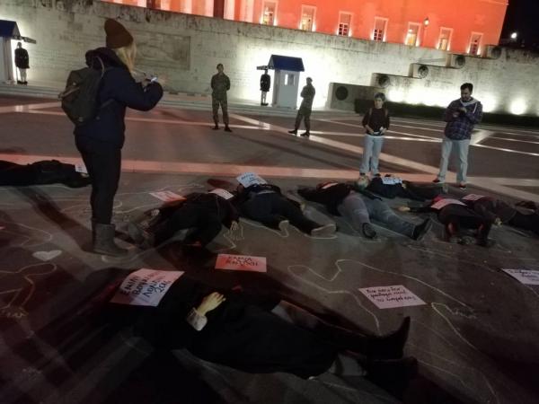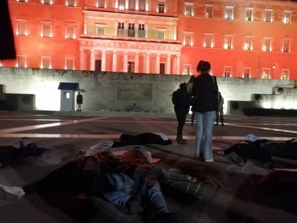 Μερικές από τις διαδηλώτριες έχουν ξαπλώσει μπροστά από το μνημείο του Αγνωστου Στρατιώτη, αναπαριστώντας τα θύματα της βίας κατά των γυναικών που μπορεί να φθάσει μέχρι και το θάνατο.
