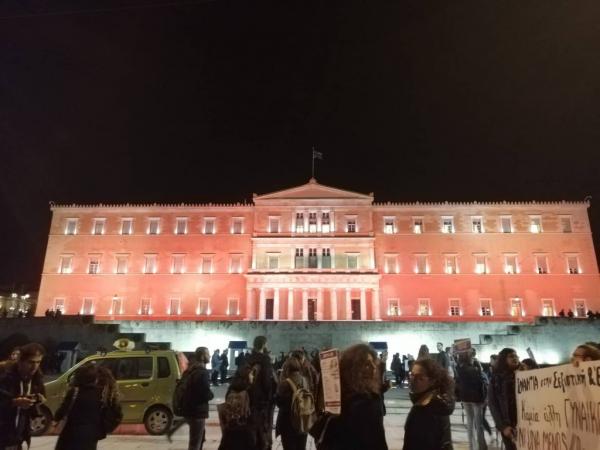 Οι διαδηλώτριες βρίσκονται στο Σύνταγμα έξω από τη Βουλή.
