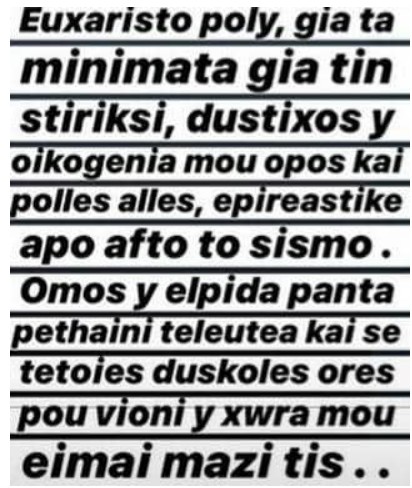 «Ευχαριστώ πολύ για τα μηνύματα για την στήριξη, δυστυχώς η οικογένειά μου όπως και πολλές άλλες επηρεάστηκε από αυτό το σεισμό. Όμως η ελπίδα πάντα πεθαίνει τελευταία και σε τέτοιες δύσκολες ώρες που βιώνει η χώρα μου είμαι μαζί της».