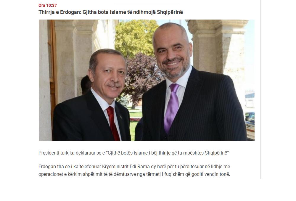 «Καλώ τον Ισλαμικό Κόσμο να υποστηρίξει την Αλβανία», γράφει στον τίτλο της η ιστοσελίδα της αλβανικής φιλοκυβερνητικής εφημερίδας Shqiptarja, που παρουσιάζει το θέμα (απόσπασμα, κάτω).