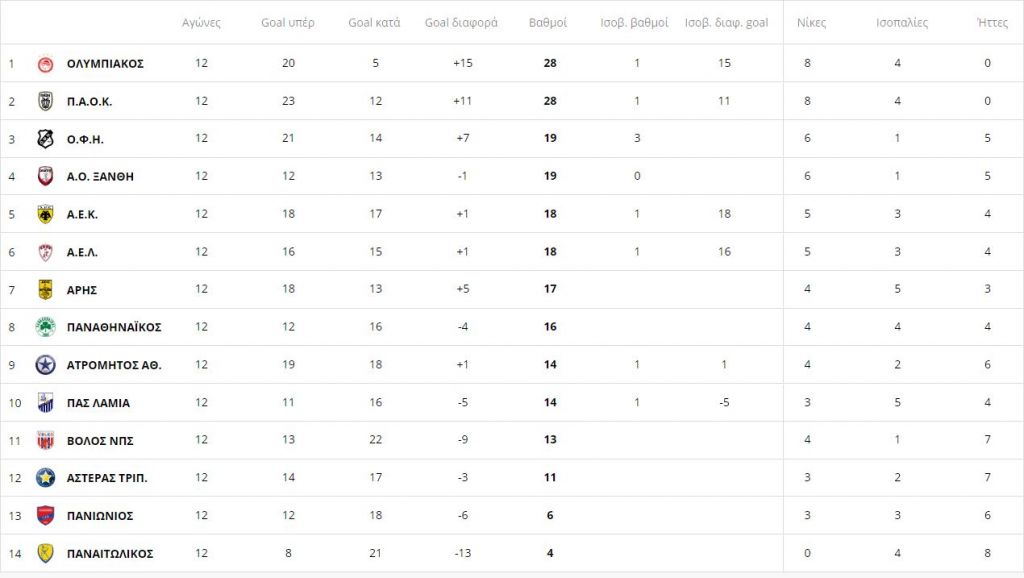 Ολυμπιακός και ΠΑΟΚ έμειναν στο 1-1 στο Φάληρο και η κατάσταση στην κορυφή της βαθμολογίας δεν άλλαξε με τις δύο ομάδες να παραμένουν ισόβαθμες (28β.) στην πρώτη θέση μετά απο 12 αγωνιστικές.