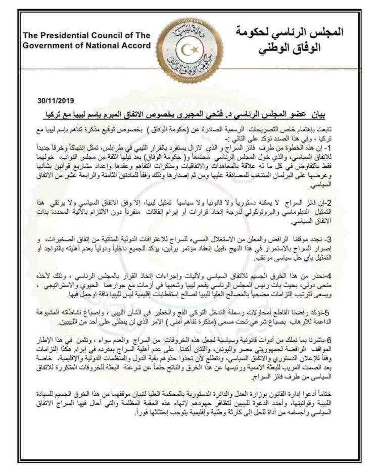 I have followed with special interest the official statements issued by the Government of National Accord regarding the signing of a Memorandum of Understanding in the name of Libya with Turkey, and in this regard I would like to emphasize the following: