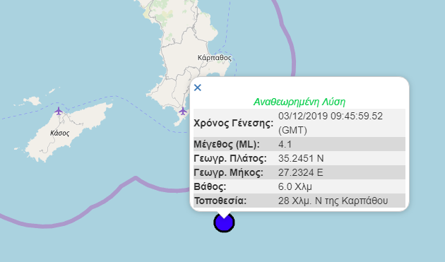 Σεισμός 4,1 Ρίχτερ σημειώθηκε πριν από λίγο στη θαλάσσια περιοχή ανοιχτά της Καρπάθου