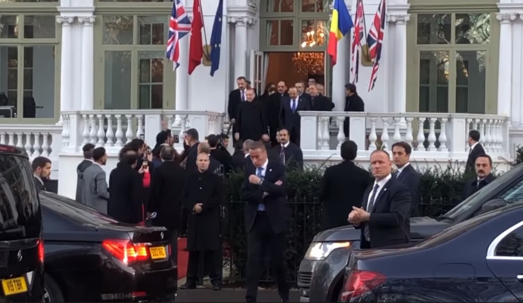 Εξω από το ξενοδοχείο όπου διαμένει ο τούρκος πρόεδρος είχαν συγκεντρωθεί οπαδοί του προκειμένου να τον υποδεχτούν. Κρατώντας τουρκικές σημαίες, άρχισαν να τον επευφημούν, μόλις βγήκε από το κτίριο για να επιβιβαστεί στο αυτοκίνητο που θα τον μετέφερε στο παλάτι του Μπάκιγχαμ για τη δεξίωση της Βασίλισσας Ελισάβετ στους ηγέτες του ΝΑΤΟ.