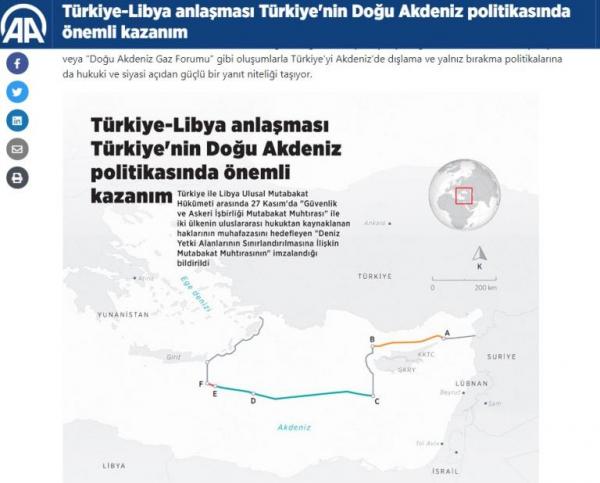 Σύμφωνα με το Anadolu, με την συμφωνία Τουρκίας-Λιβύης μπορεί να μην λύνονται εντελώς όλες οι διαμάχες αλλά η Τουρκία έχει ένα σημαντικό κέρδος από την άποψη της στήριξης των δικών της νομικών και πολιτικών επιχειρημάτων.