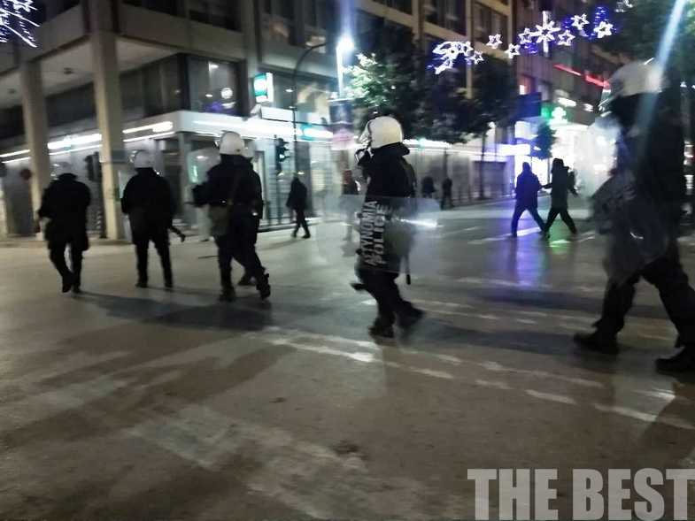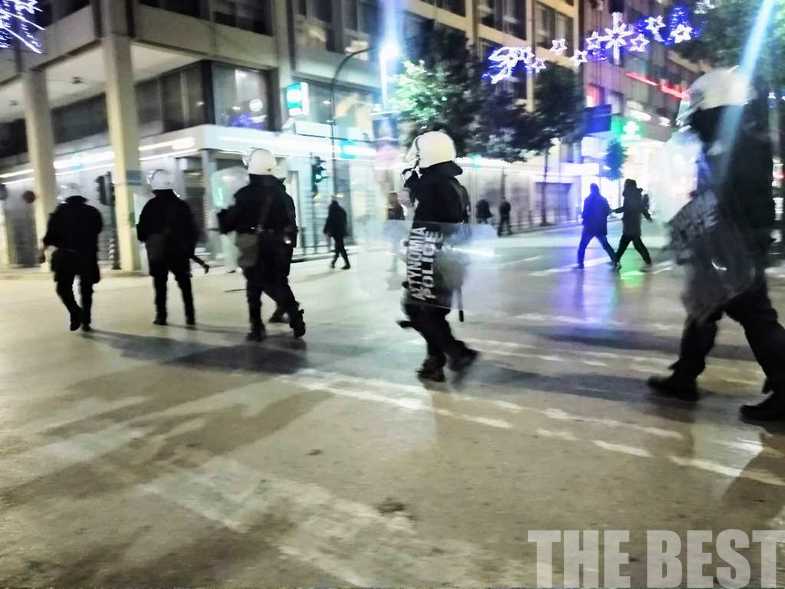 Οι αντιεξουσιαστές τρέχουν προς το Παράρτημα και τους ακολουθούν οι άνδρες των ΜΑΤ. Προκλήθηκε φωτιά σε μπαλκόνι.