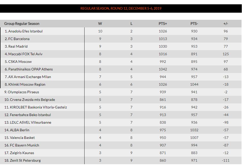 Τα αποτελέσματα και η βαθμολογία της Euroleague