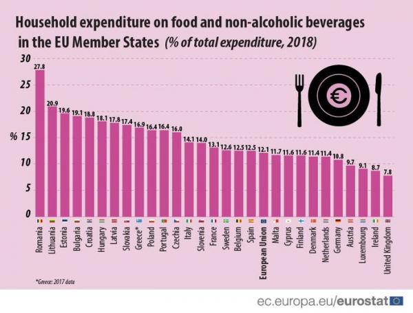 Η Ελλάδα βρίσκεται στην ένατη θέση στην ΕΕ με 16,9% (η μόνη χώρα με στοιχεία 2017) όμως μακράν το υψηλότερο ποσοστό καταγράφηκε στην Ρουμανία, όπου το 27,8% της καταναλωτικής δαπάνης (1/5) προορίζεται για τροφή και μη αλκοολούχα ποτά, δηλαδή υπερδιπλάσιο σε σχέση με τον κοινοτικό μέσο όρο.