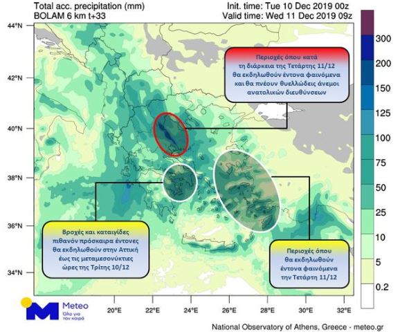 Επισημαίνεται ότι λόγω του πολύ ενισχυμένου ανατολικού ρεύματος που θα πνέει στο Βόρειο Αιγαίο με εντάσεις 8-9 μποφόρ, τα φαινόμενα σε αυτές τις περιοχές θα συνεχιστούν κατά τόπους έως το απόγευμα της Τετάρτης 11/12.