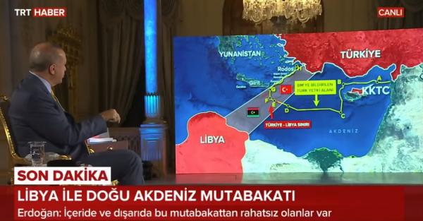 Ο Τούρκος ηγέτης μετά το μνημόνιο που υπέγραψε με τη Λιβύη, μιλώντας στο TRT εξήγησε με ειδικούς χάρτες ποιες είναι οι προθέσεις της Τουρκίας στην ανατ. Μεσόγειο, προεξοφλώντας ότι η Ελλάδα πλέον δεν μπορεί να αντιδράσει, γεγονός που την έχει τρελάνει.