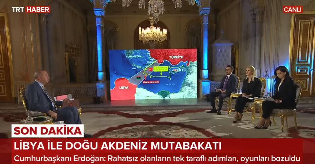 Ο Ρετζέπ Ταγίπ Ερντογάν υποστήριξε ότι η Τουρκία έχει αντικριστές ακτές με τη Λιβύη, όπως απαιτεί το διεθνές δίκαιο της θάλασσας, το οποίο και εφάρμοσε, κι αυτό έκανε την Ελλάδα να τρελαθεί.