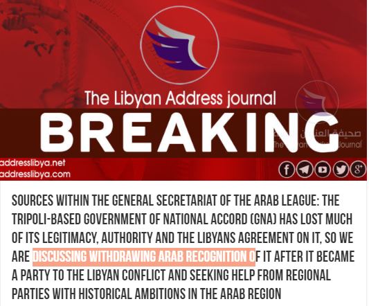 Οπως μετέδωσε σε έκτακτη είδησή της η λιβυκή ιστοσελίδα addresslibya.co, επικαλούμενη πηγές στη Γενική Γραμματεία του Αραβικού Συνδέσμου, ο λόγος επανεξέτασης της αναγνώρισης προς την κυβέρνηση της Τρίπολης είναι ότι αυτή « έχει χάσει μεγάλο μέρος της νομιμότητάς της (…) καθώς έγινε μέρος της σύγκρουσης… » μετά το μνημόνιο κατανόησης που υπέγραψε με την τουρκική κυβέρνηση.