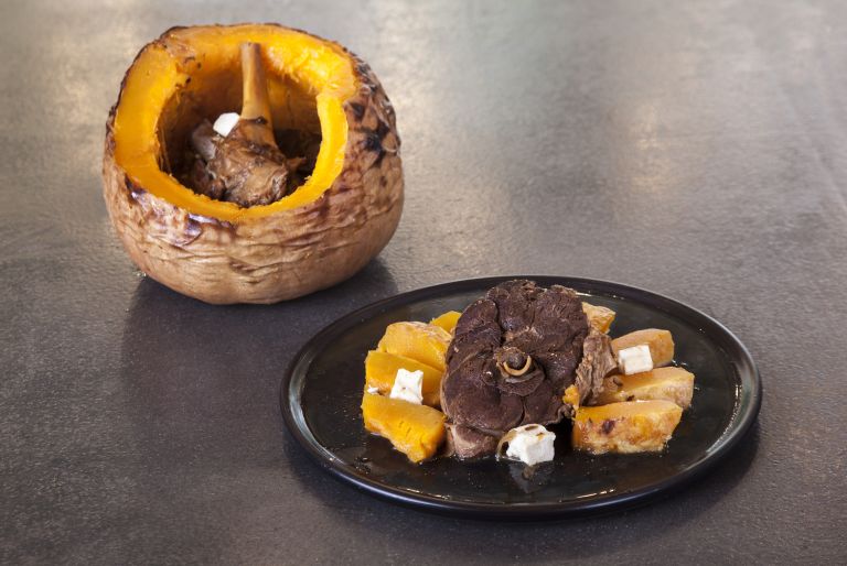 Προθερμαίνουμε τον φούρνο στους 170°C. Βάζουμε μέσα στην κολοκύθα τα κομμάτια του κρέατος, χωρίς να αφήνουμε κενά. Προσθέτουμε το ζουμί της κατσαρόλας και τη φέτα. Σκεπάζουμε την κολοκύθα με το καπάκι της και το καρφώνουμε στη θέση του με οδοντογλυφίδες. Τη βάζουμε σε ένα ταψί και ψήνουμε για περίπου 3 ώρες. Αφαιρούμε το καπάκι προσεκτικά.