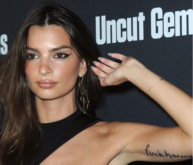 Η Έμιλι Ρατακόφσκι εμφανίστηκε σε πρεμιέρα ταινίας στο Λος Άντζελες και σήκωσε το μπράτσο της ώστε να δείξει στις κάμερες το μήνυμα που χάραξε στο δέρμα της με αποδέκτη τον Γουάινστιν: «γαμ@@@@ τον Χάρβεϊ». Κάποιες από τις φωτογραφίες αυτής της εμφάνισής της ανέβασε και στο instagram.