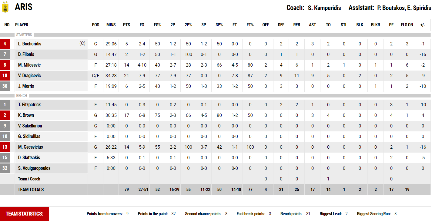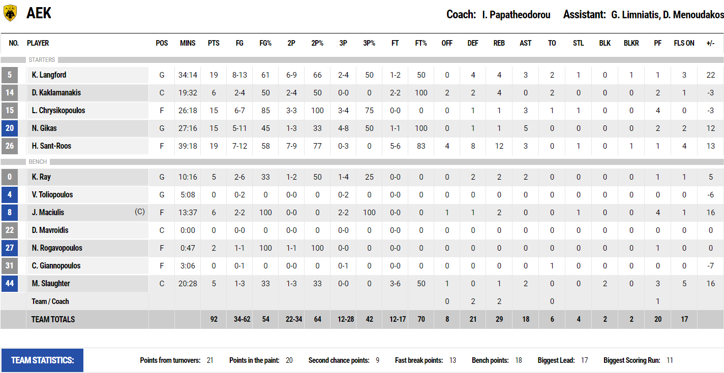 Κομβικός ήταν ο Νίκος Γκίκας με τα συνεχόμενα καλάθια του στο τέλος και τους 15 πόντους που έβαλε ενώ οι Κιθ Λάνγκφορντ και Σαντ Ρος πέτυχαν από 19 πόντους.