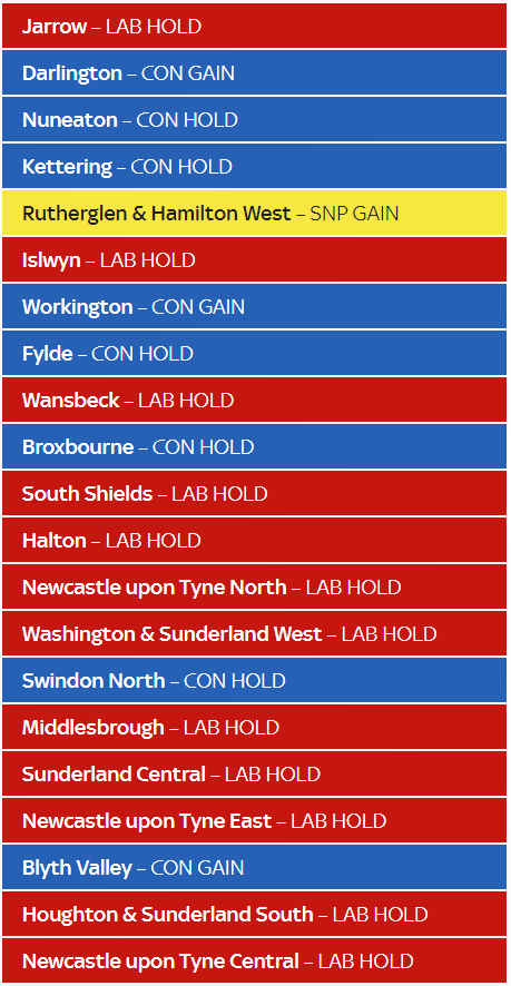 Μάλιστα, στις 21 έδρες που έχουν ανακοινωθεί, από τις συνολικά 650, η… μερίδα του λέοντος -ήτοι οι 12- έχουν πάει στους Εργατικούς του Τζέρεμι Κόρμπιν. Από την άλλη πλευρά ο Μπόρις Τζόνσον έχει δει, μέχρι στιγμής, 8 έδρες να πηγαίνουν στους Συντηρητικούς.