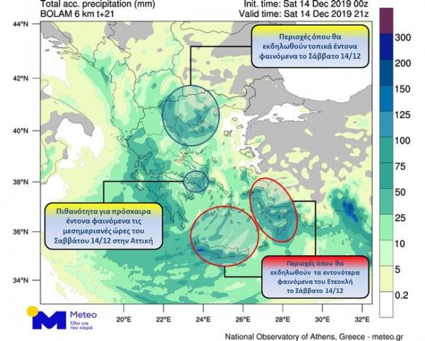 Στο χάρτη φαίνεται ο ολικός υετός που αναμένεται έως το βράδυ του Σαββάτου 14/12 καθώς και οι περιοχές όπου αναμένονται τα σημαντικότερα φαινόμενα του «Ετεοκλή».
