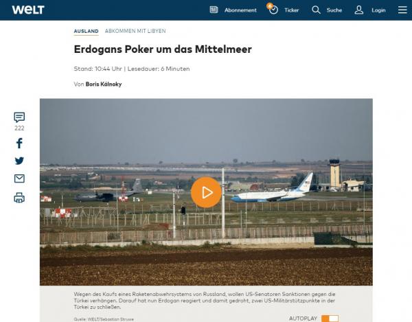 «Ο Ερντογάν ποντάρει στην επέκταση της δικής του ζώνης επιρροής και την μετατροπή της Τουρκίας σε μια νέα μεγάλη νεο-οθωμανική αυτοκρατορία. Τουρκικά στρατεύματα βρίσκονται ήδη στο βόρειο Ιράκ και τη βόρεια Συρία και στο εμιράτο του Κατάρ. Και τώρα ίσως πάνε και στη Λιβύη. Πρόσφατα η Τουρκία και η Λιβύη προχώρησαν στη σύναψη ενός μνημονίου, μιας συμφωνίας για τον καθορισμό των θαλάσσιων συνόρων» εξηγεί η die Welt.