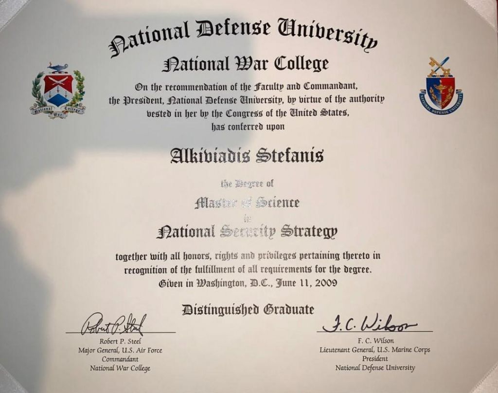 «Σε ό,τι αφορά στο πρώτο, ήταν ομαδικό πρόγραμμα σπουδών του ΥΠΕΘΑ για τη Διαχείριση Κρίσεων. Σε ό,τι αφορά στο δεύτερο, ήμουν ο μοναδικός Έλληνας Αξιωματικός τη χρονιά 2008-2009 λόγω του ότι αρίστευσα στη Σχολή Εθνικής Άμυνας, αποφοιτώντας πρώτος και σύμφωνα με τις διαδικασίες, ως επιβράβευση και πληρώντας όλα τα υπόλοιπα στοιχεία επιλέχθηκα από το Συμβούλιο. Κατά τις εκεί σπουδές μου, εκτός της Ακαδημαϊκής μου αριστείας, ήμουν ο Πρόεδρος της επιτροπής Ηθικού του Πανεπιστημίου. Ολοκλήρωσα τις σπουδές μου ως Διακεκριμένος Απόφοιτος και βραβεύτηκα από το Γενικό Επιτελείο Στρατού», πρόσθεσε ο υφυπουργός Άμυνας και σε υστερόγραφο συμπλήρωσε : «Υ.Γ.: Τα παραπάνω αποτελούν διαδικασίες των Ενόπλων Δυνάμεων, ακολουθούμενες για την επιμόρφωση των στελεχών, στο πλαίσιο της επιζητούμενης αριστείας και όχι για τη λήψη επιδομάτων ή για ακαδημαϊκή καριέρα».