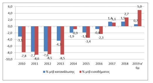 Το 2018 και το α΄ εξάμηνο του 2019, όπως αναφέρει η έκθεση το διαθέσιμο εισόδημα αυξάνεται ταχύτερα της κατανάλωσης.