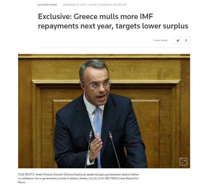 «Είναι δυνατή μία νέα πρόωρη αποπληρωμή πρόσθετου μέρους των δανείων του ΔΝΤ το 2020», δηλώνει στο Reuters o υπουργός Οικονομικών Χρήστος Σταϊκούρας