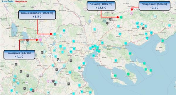 Ανάλογα, στην ανατολική Μακεδονία ο Λαϊλιάς στα 1.015 μέτρα είχε +12,8 βαθμούς ενώ το γειτονικό Νευροκόπι στα 585 μέτρα είχε μόνο -2,1 βαθμούς.