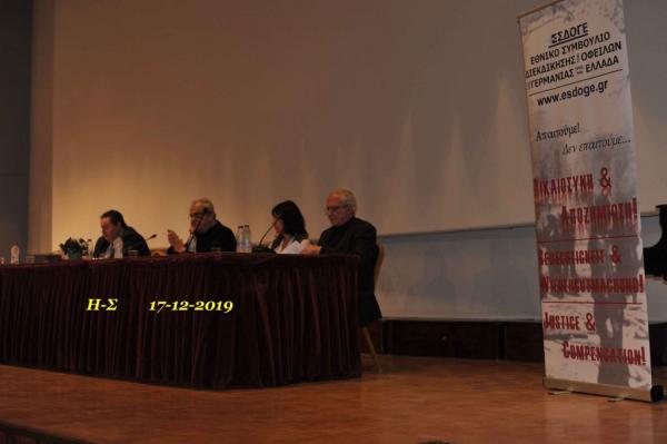 Το Εθνικό Συμβούλιο Διεκδίκησης των Οφειλών της Γερμανίας προς την Ελλάδα οργάνωσε εκδήλωση, υπό την αιγίδα της Βουλής των Ελλήνων, την Τρίτη 17.12.2019, στο Πολεμικό Μουσείο με τον εύγλωττο τίτλο: «Η ΔΙΕΚΔΙΚΗΣΗ ΤΩΝ ΓΕΡΜΑΝΙΚΩΝ ΟΦΕΙΛΩΝ ΣΕ ΚΡΙΣΙΜΗ ΚΑΜΠΗ – ΠΡΟΣΚΛΗΤΗΡΙΟ ΑΓΩΝΑ!»
