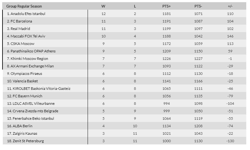 Τα αποτελέσματα και η βαθμολογία της Ευρωλίγκας