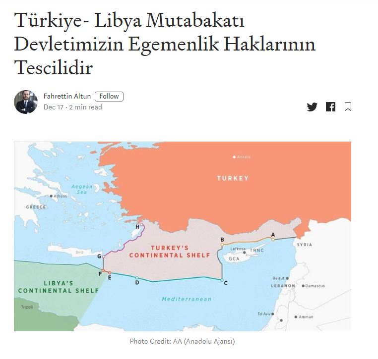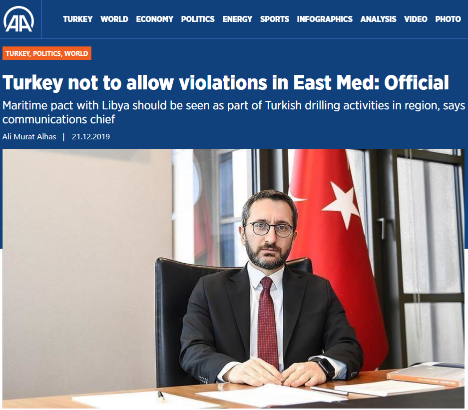 Σύμφωνα με το τουρκικό πρακτορείο ειδήσεων Anadolu, ο εκπρόσωπος της τουρκικής προεδρίας με άρθρο του αναφέρει πως το Μνημόνιο Τουρκίας – Λιβύης, εξασφαλίζει πως η Τουρκία δεν θα κάνει τα «στραβά μάτια» σε οποιαδήποτε συμφωνία φέρνει… προ τετελεσμένου την χώρα του στην περιοχή, ενώ διευκρινίζει πως η Τουρκία είναι ένας παράγοντας που δεν θα πρέπει να αγνοηθεί.