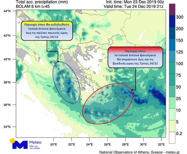 Τα φαινόμενα, που κατά τόπους θα είναι έντονα, θα συνεχίσουν να επηρεάζουν τα δυτικά και νότια ηπειρωτικά έως τις πρώτες πρωινές ώρες της Τρίτης, ενώ στην Κρήτη και στα Δωδεκάνησα θα επιμείνουν έως και τις βραδινές ώρες της Τρίτης.