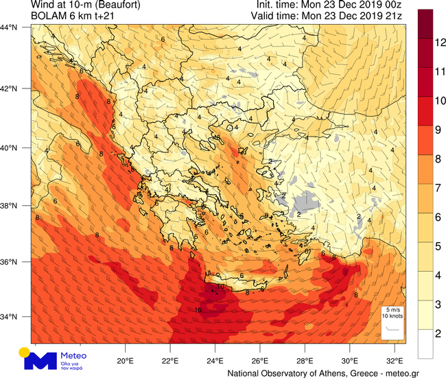 Παράλληλα, πολύ ενισχυμένοι άνεμοι εντάσεων έως 8 μποφόρ θα πνέουν στα πελάγη, ενώ σε περιοχές της Κρήτης και ιδιαίτερα στο Δυτικό Λιβυκό Πέλαγος οι εντάσεις των δυτικών ανέμων θα φτάσουν τοπικά τα 9-10 μποφόρ, όπως διακρίνεται στο χάρτη 2.